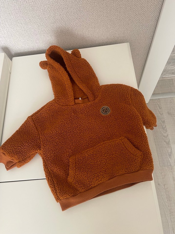 Kahverengi kapüşonlu erkek çocuk sweatshirt, yumuşak kürk dokusuyla uzun kollu ve bol kesimdir. Baskılı detay ve ön cep bulunur, rahat sokak stili için uygundur.