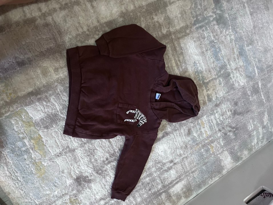 Kapüşonlu ve uzun kollu erkek çocuk sweatshirtü, bol kesimdir. Yumuşak ve sıcak kumaştan yapılmış, baskılı zebra deseni ve kürk detayları vardır. Koyu kahverengi, sokak stili için uygundur.