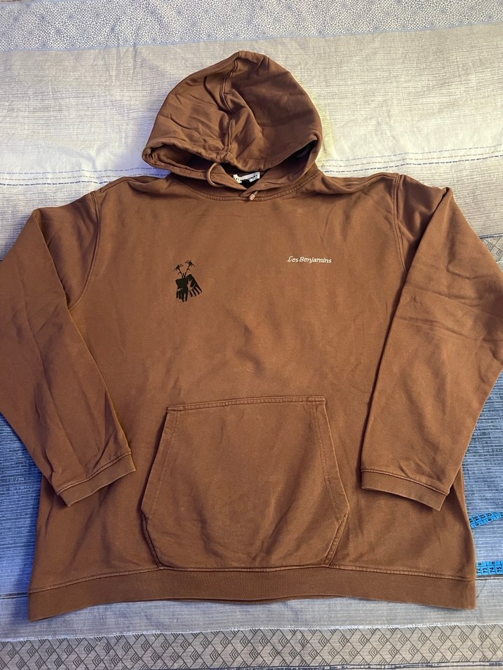 Kahverengi kapüşonlu sweatshirt, uzun kollu ve rahat kesimdedir. Yumuşak ve sıcak kumaştan üretilmiş, günlük kullanım için uygundur.