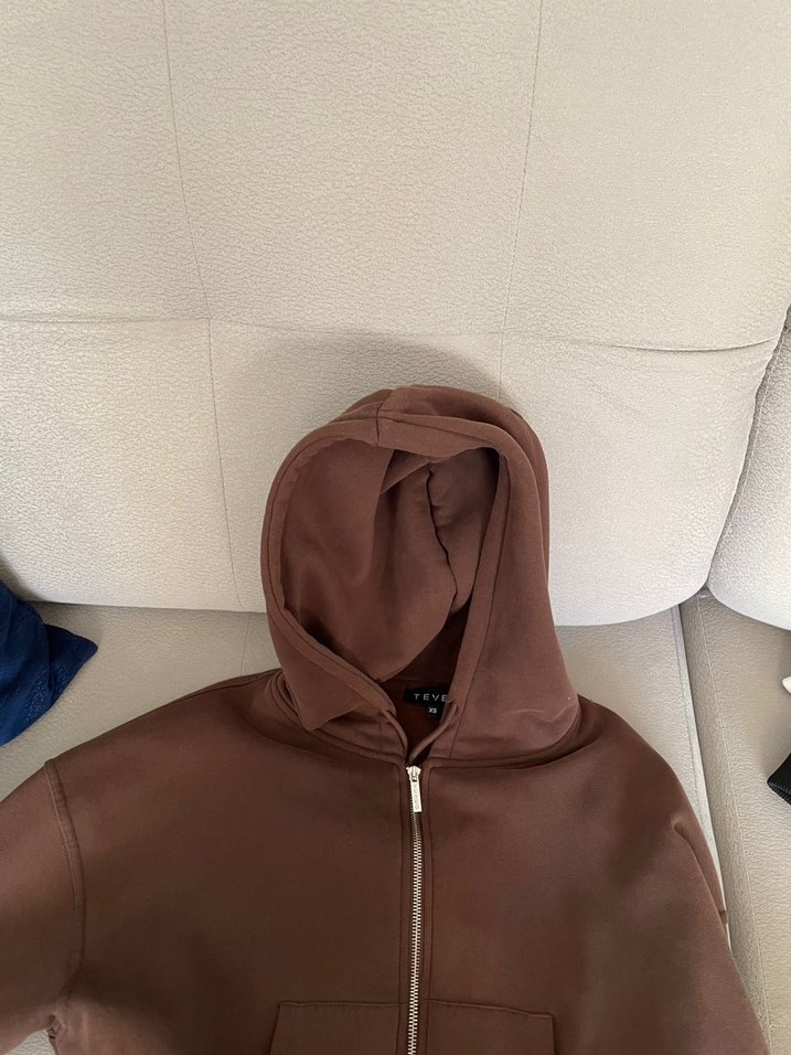 Kahverengi kapüşonlu ve fermuarlı, uzun kollu, normal boy bol kesim sweatshirt. Rahat ve sokak stiline uygun.