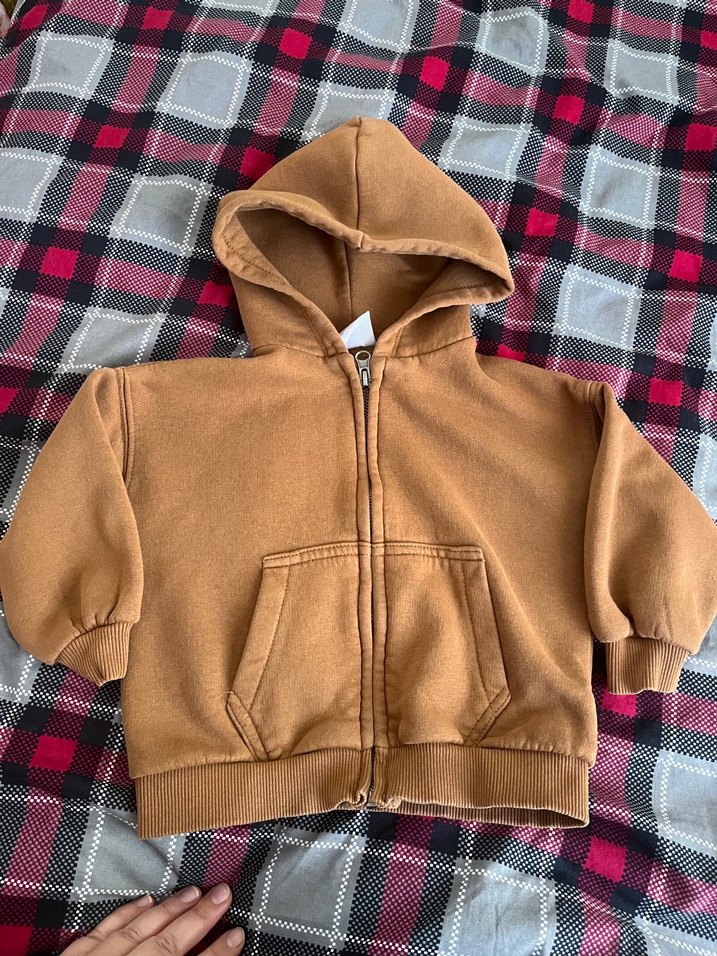 Kahverengi kapüşonlu, fermuarlı, uzun kollu erkek çocuk sweatshirtü, rahat kesim ve yumuşak, sıcak kumaştan üretilmiştir. Düz ve desensiz tasarıma sahiptir.