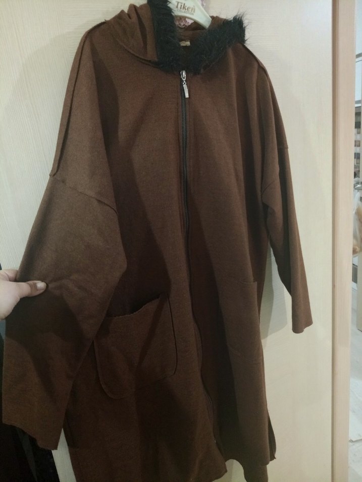 Kahverengi uzun, bol kesim kadın kaban, fermuarlı ön, uzun kollu ve yuvarlak yakalıdır. Yumuşak ve sıcak kumaştan üretilmiş, günlük rahat sokak stili için uygundur.