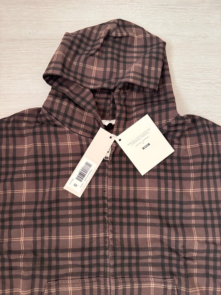 Koyu kahverengi baskılı, kapüşonlu ve fermuarlı pijama üstü. Uzun kollu, bol kesim ve midi boyda, rahat ve günlük kullanıma uygun.