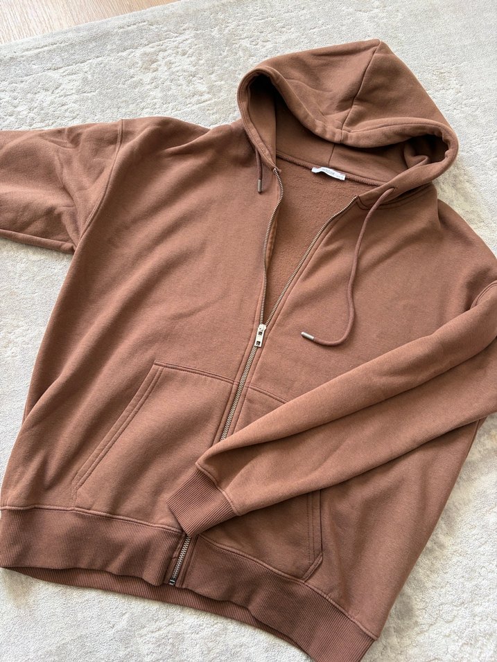 Addax kahverengi kapüşonlu ve fermuarlı bol kesim sweatshirt. Uzun kollu ve normal boyda, günlük sokak stiline uygun. Aynı ceketin krem ve siyahı da var ilgilenenler için