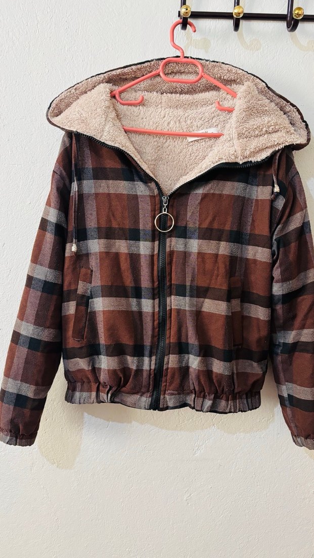 Kahverengi kadın ceketi, kapüşonlu, cepli ve uzun kolludur. İç kısmı kürklü yumuşak kumaşla kaplıdır, dışı koyu renkli ekose deseniyle hem günlük hem spor kombinlere çok yakışır. Temiz kullanılmıştır, herhangi bir yırtık/leke yoktur. Sonbahar–kış için ideal Sorunuz olursa memnuniyetle cevaplarım.
