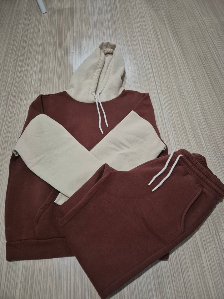 Kahverengi ve bej renk bloklu kapüşonlu üst ve kısa paçalı alt parçadan oluşan kadın eşofman takımı. Uzun kollu, bisiklet yaka, rahat kesim ve yumuşak dokulu kumaş ile günlük kullanıma uygun. Hafif kusurları var ama iyi durumda. tekliflere açık.