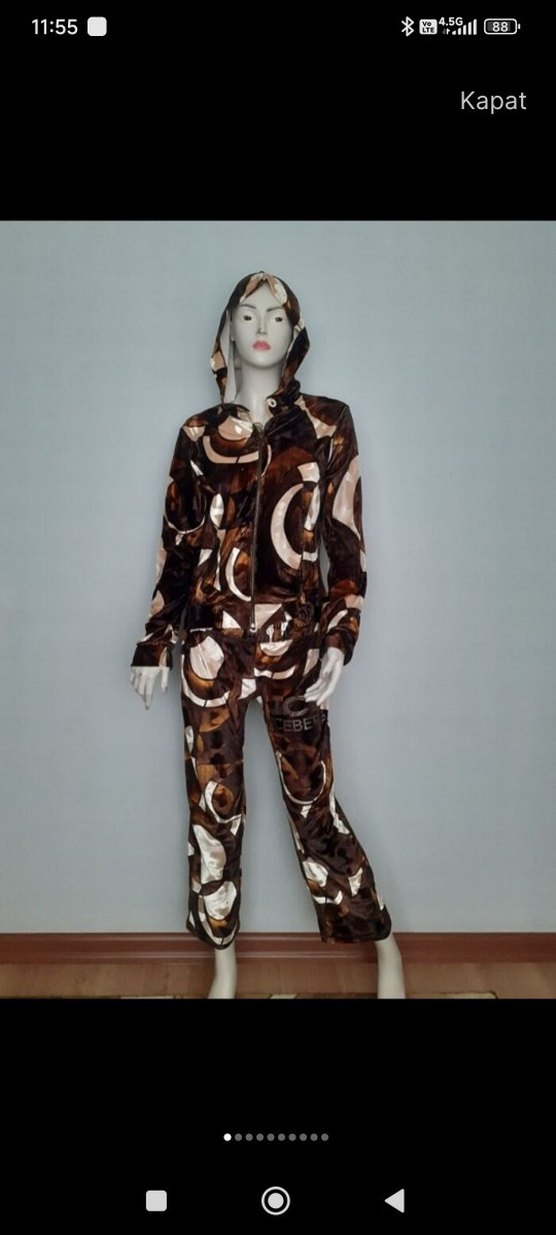 Kadınlar için uzun kollu, kapüşonlu ve bol kesim eşofman takımı. Yumuşak ve sıcak kumaştan, koyu kahverengi batik desenli ve kürk detaylıdır. Günlük kullanıma uygun rahat ve çağdaş stil sunar.