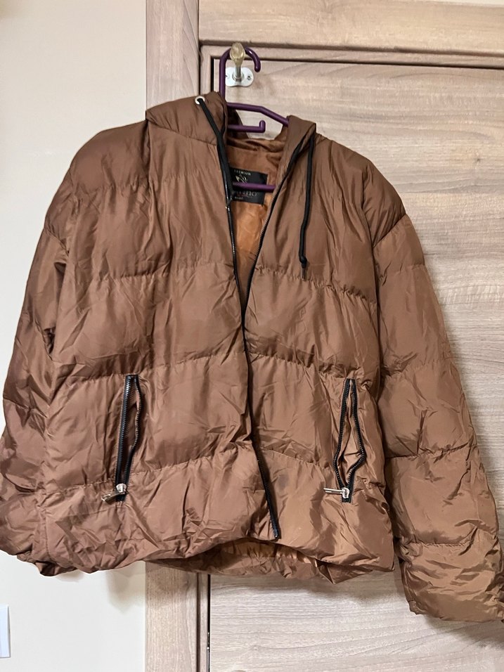 Kahverengi parlak yüzeyli kadın kışlık mont, uzun kollu ve fermuarlı. Salaş kesim, kesik yakalı ve midi boyda, günlük kullanıma uygun. Bazı yerlerde kollarındeaki elyaf kaymış bazı yerlerde toplanmış yıkanmadan dolayı rahatsoz edici değil