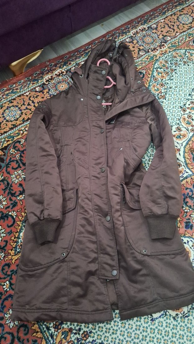 Kahverengi uzun kışlık mont, kapüşonlu ve kürk detaylıdır. Sentetik kumaştan, bol kesim ve uzun kolludur, rahat sokak stiline uygundur. fermuarinda sıkıntı var ❄️