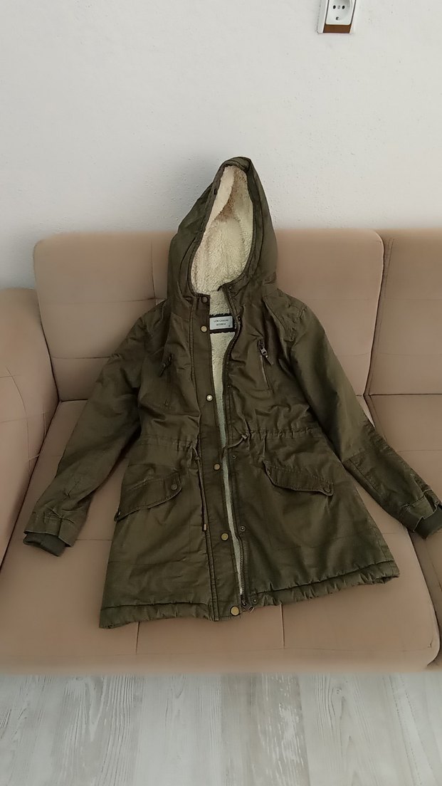 Kadın mont, bol kesim uzun kollu ve kapüşonludur. İç kısmı peluş detaylı, dışı kahverengi düz renkte, dış mekan için uygundur.
