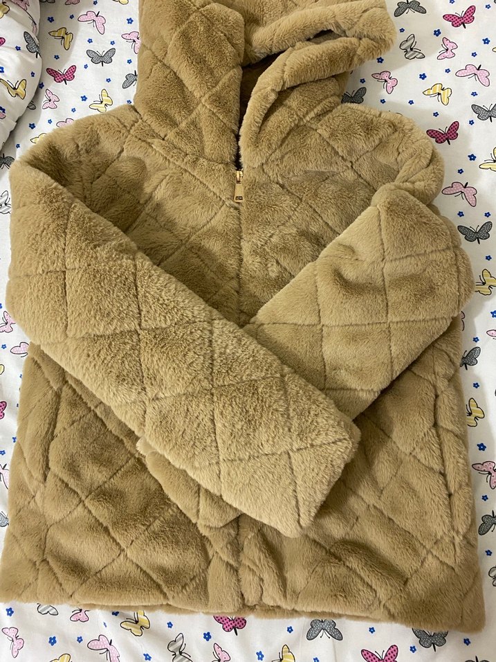 Kahverengi kapüşonlu ceket, yumuşak peluş dokusu ve rahat kesimiyle günlük kullanım için uygundur. Bir iki kere kullandım