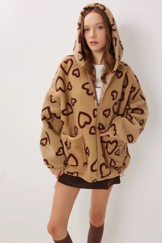Kahverengi Kapüşonlu Kadın Peluş mont