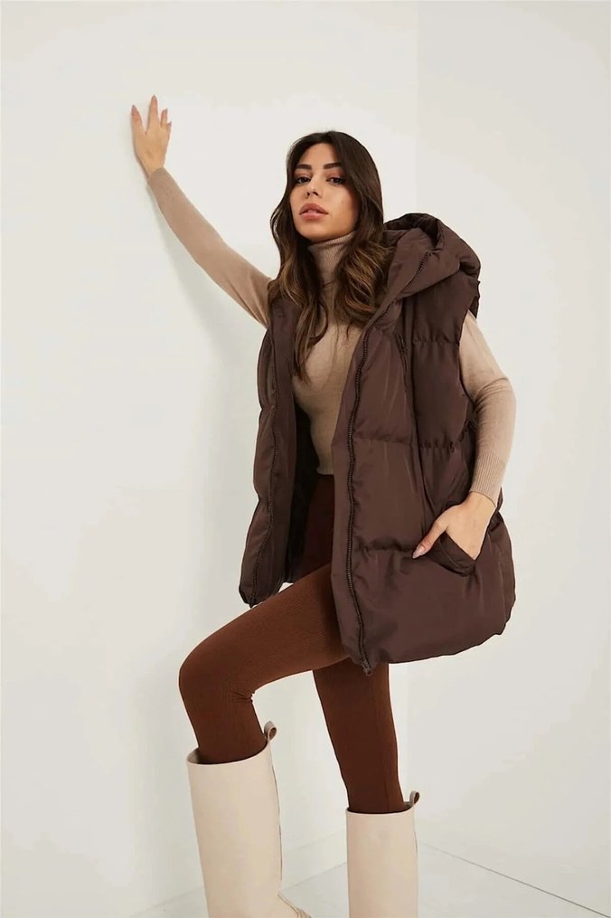 Kahverengi, kapüşonlu, yüksek yakalı, kolsuz ve vücuda oturan bu yelek, yumuşak ve sıcak kumaştan üretilmiştir. Günlük sokak stili için şık ve rahat bir tercihtir.