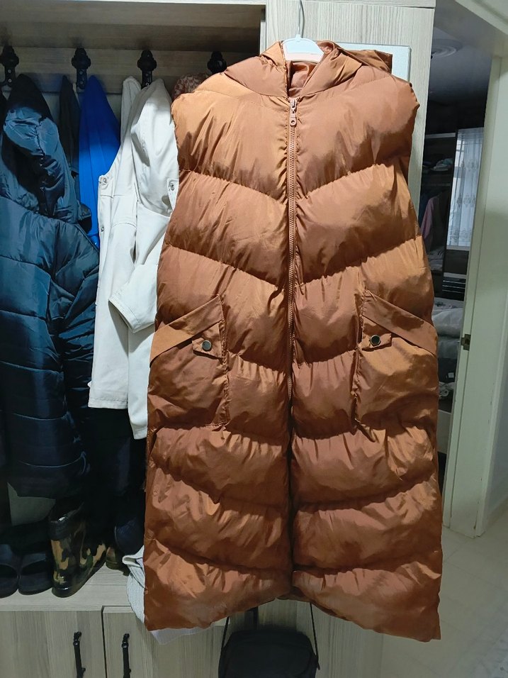 Kahverengi, kapüşonlu, fermuarlı ve cepli şişme yelek. Rahat sentetik kumaştan, midi boy ve dar kesim. Sokak stili için uygun.