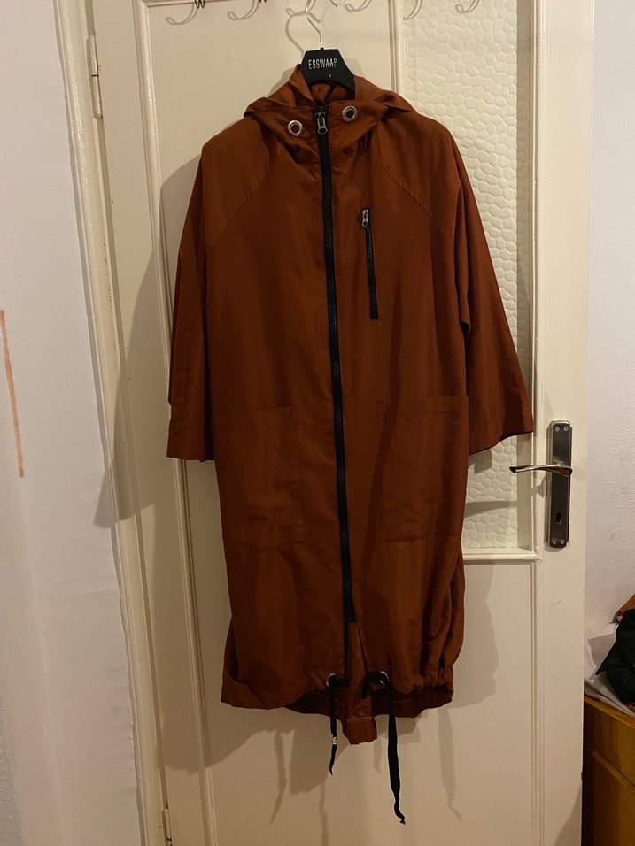 Kahverengi süet kumaştan, kapüşonlu ve uzun kollu, bol kesim midi boy trençkot. Bel detaylı, günlük sokak stili için uygun. ☂️