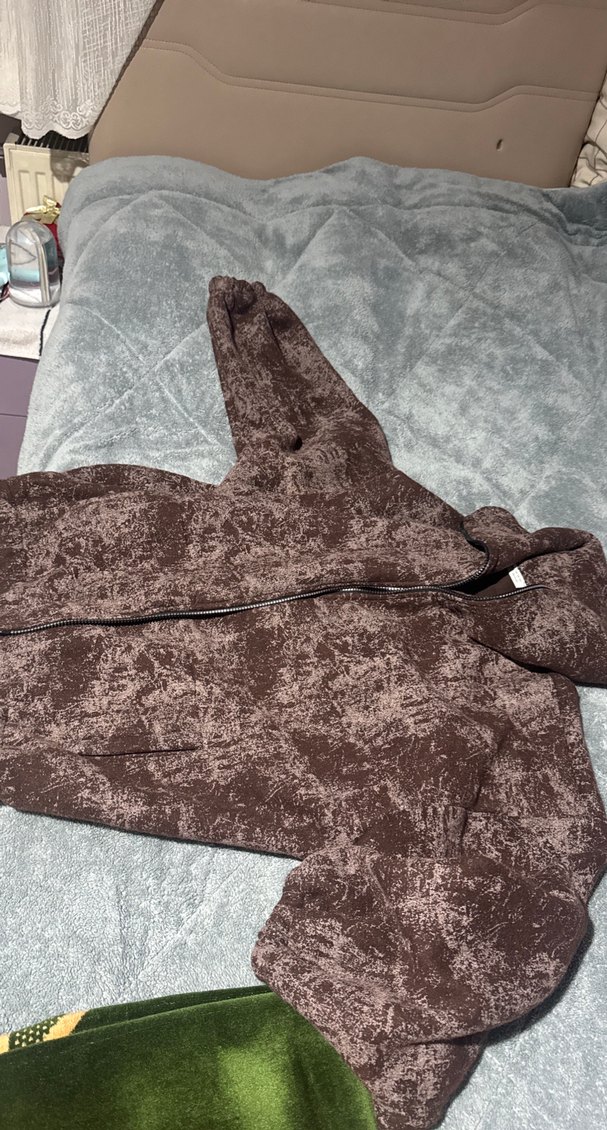 Kahverengi, kapüşonlu ve fermuarlı, bol kesim kadın sweatshirtü. Yumuşak keten kumaştan, rahat sokak stili için uygun. L XL UYGUN BAYA BOL
