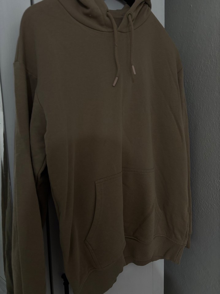 Kahverengi, kapüşonlu, uzun kollu ve rahat kesim kadın sweatshirtü. Yumuşak ve sıcak kumaştan üretilmiş, günlük kullanıma uygun şık bir parça.