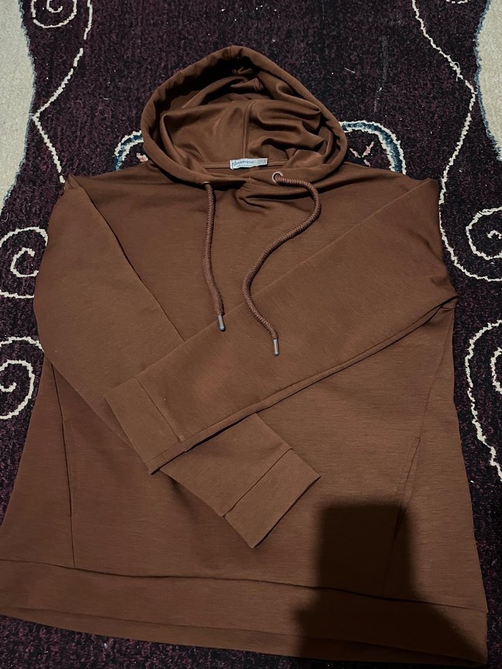 Kahverengi, kapüşonlu, uzun kollu, bol kesim kadın sweatshirt. Yumuşak sentetik kumaştan üretilmiş, sade ve günlük kullanıma uygun rahat bir modeldir.