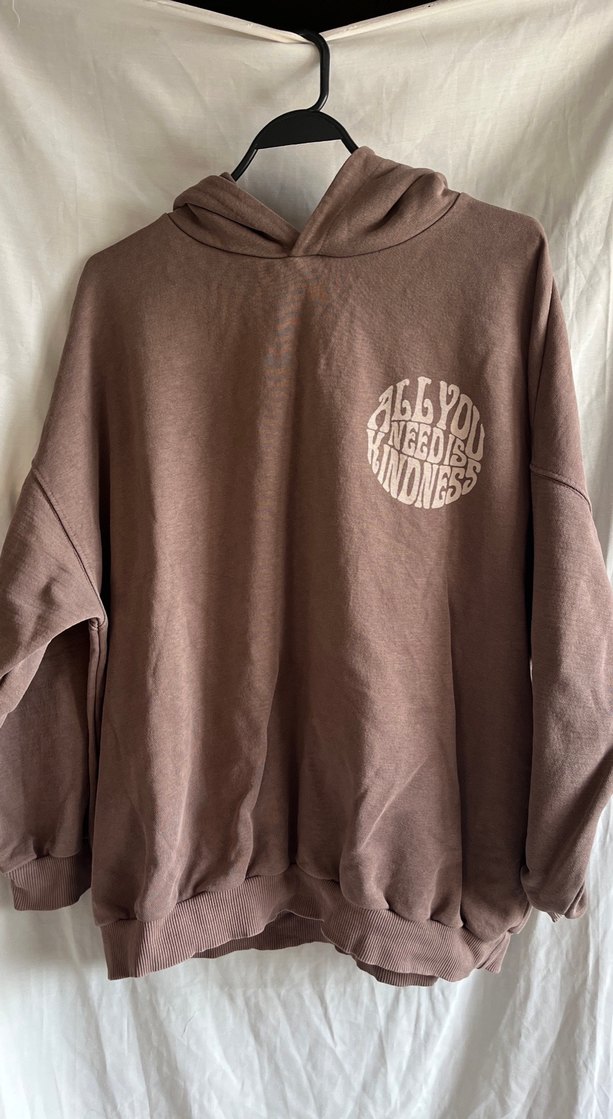 Bej renkli, uzun kollu, kapüşonlu ve bol kesim kadın sweatshirt. 'All you need is kindness' yazılı baskısı bulunur. Yumuşak kumaştan, rahat bohem tarzda.