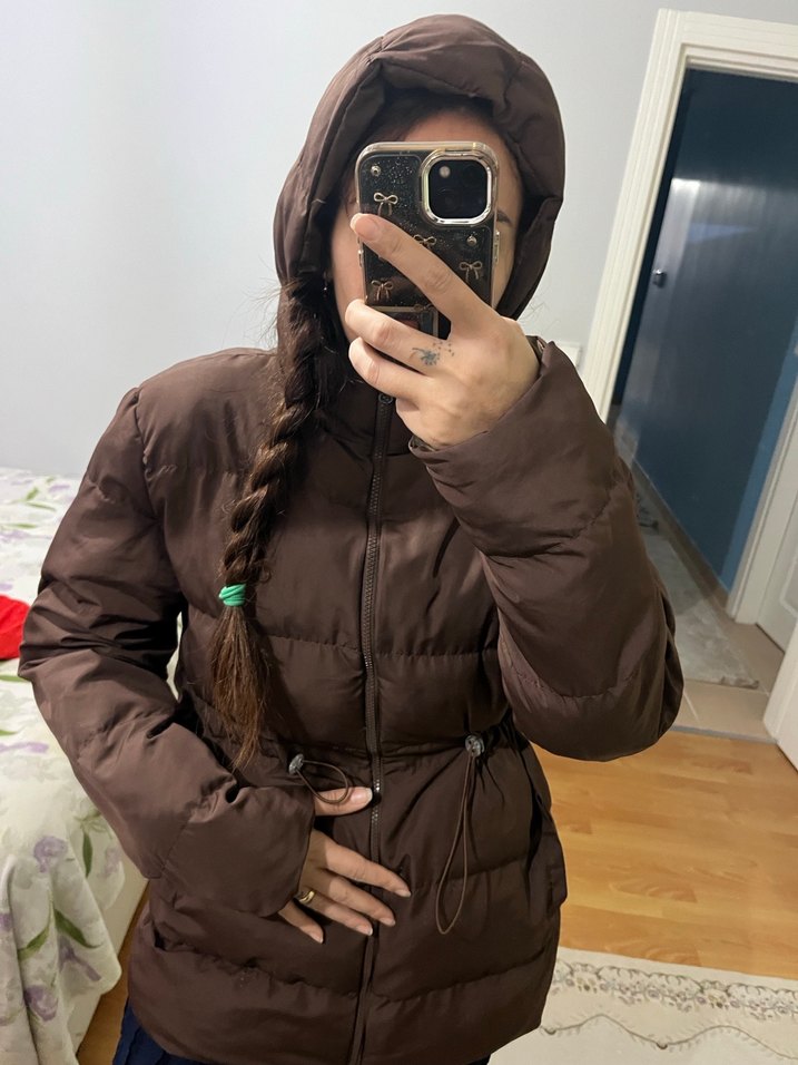 Kahverengi, midi boy kışlık mont yüksek yakalı ve uzun kolludur. Kemerli, fitted kesimle sıcak ve rahat bir sokak stili sunar. Soğuk günler için ideal. ❄️ Şapka iç astardan yırtılmış az Bide sıkma yeri sol taraf kırılmış Yıkadım toplandı içi ya uğraşamam ondan satiyorum