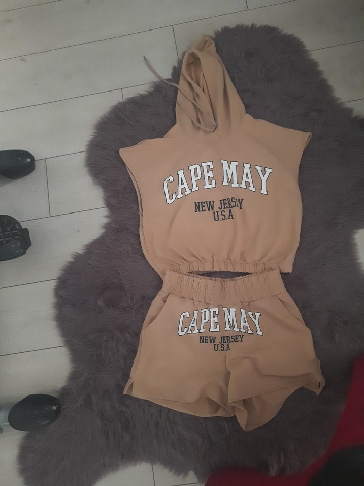 Kahverengi, kapüşonlu ve kolsuz mini eşofman takımı, straplez yaka ve belden kemerli. Yumuşak kumaştan, rahat kesimli, baskılı "CAPE MAY" yazılı. ️