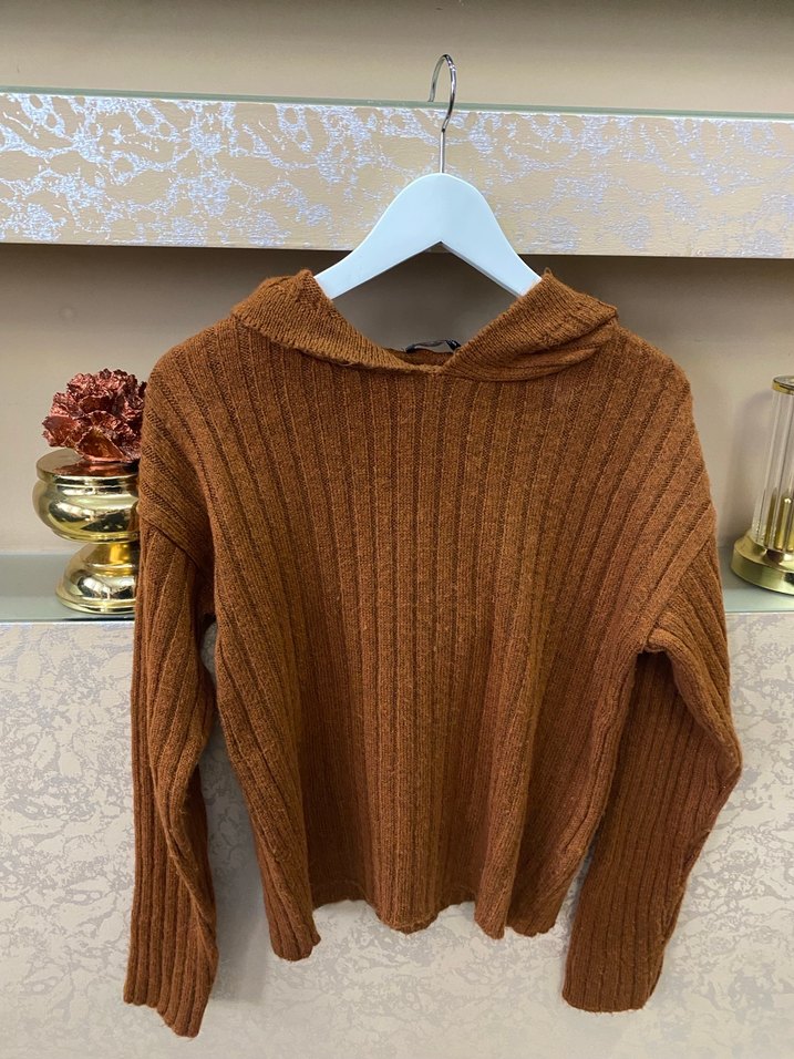 Kahverengi örgü kadın kazak, kapüşonlu, uzun kollu ve bol kesimdir. Günlük kullanıma uygun rahat ve şık bir sokak stili sunar.