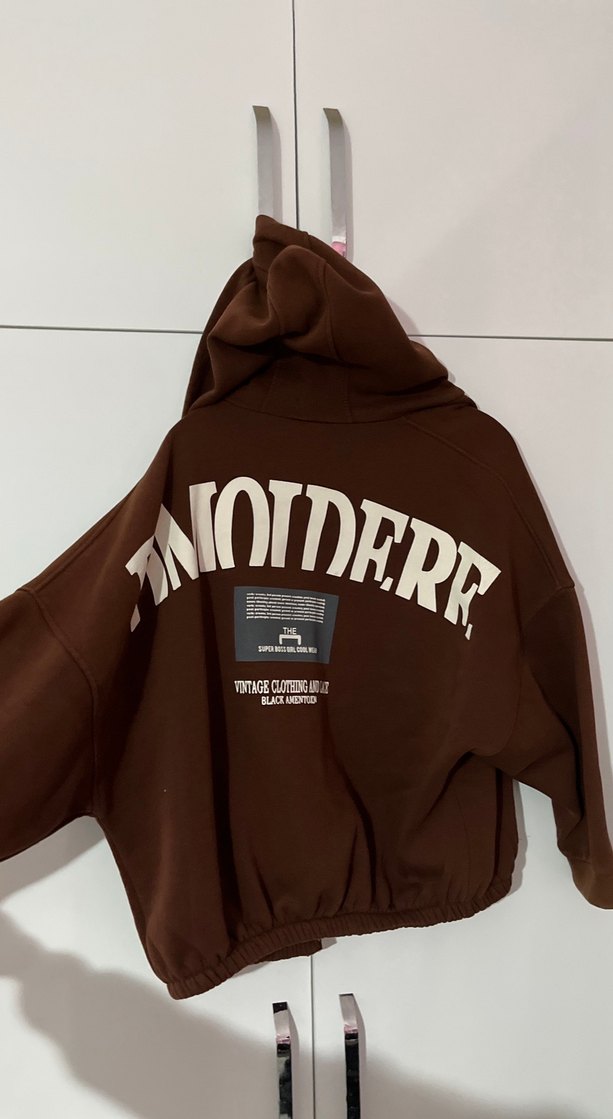 Kahverengi kapüşonlu sweatshirt, uzun kollu ve bol kesimdir. Sıcak ve yumuşak kumaştan üretilmiş, sırtında büyük baskılar ve etiket bulunur. Günlük kullanım için uygundur.