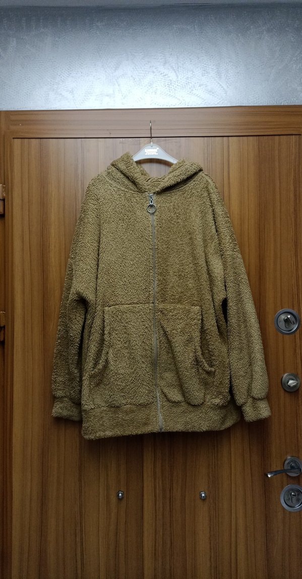 Bu kahverengi kapüşonlu ceket, yumuşak ve tüylü kumaştan, bol kesim ve uzun kolludur. Fermuarlı ve cep detaylıdır, rahat sokak stili için uygundur.