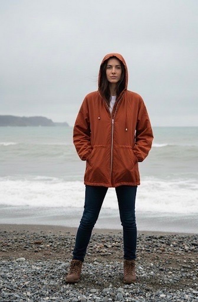 Kahverengi kapüşonlu yağmurluk , bol kesim ve uzun kollu, parlak yüzeye sahip. Günlük kullanıma uygun, yumuşak ve sıcak kumaştan midi boyda rahat bir model.
