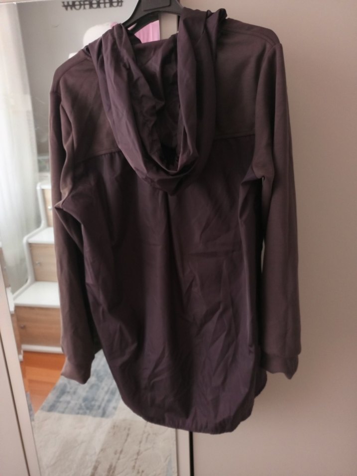 Kahverengi, uzun kollu, yüksek yakalı, salaş kesim midi boy hamile ceketi. Yumuşak sentetik kumaştan, kapüşonlu ve günlük rahat sokak stili için uygundur.