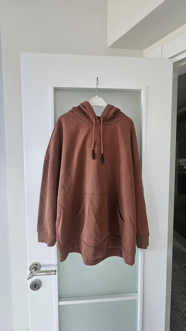 Kahverengi kapüşonlu sweatshirt, salaş kesim ve uzun kollu. Yumuşak ve sıcak kumaştan, desensiz ve midi boyda, günlük kullanıma uygun. Uniseks
