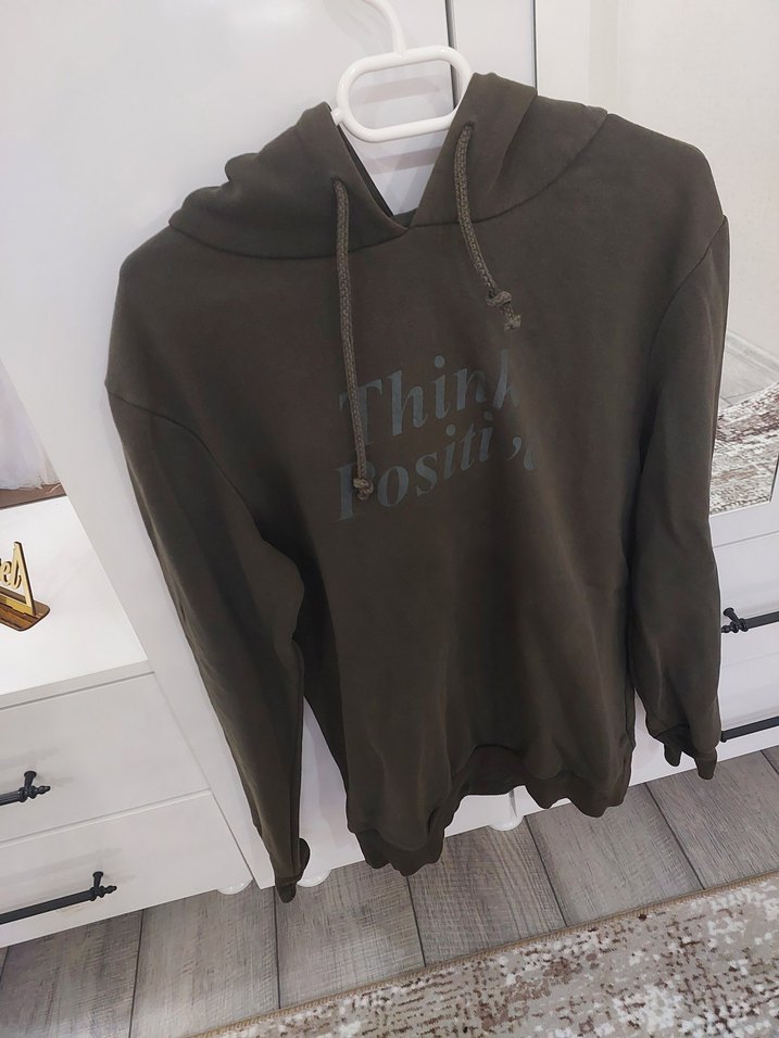 Kahverengi kapüşonlu, uzun kollu ve salaş kesim sweatshirt, baskılı desen ve kemer detayına sahip. Yumuşak ve sıcak kumaştan üretilmiştir.