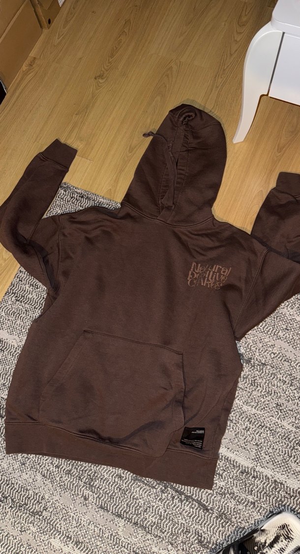 Kahverengi kapüşonlu sweatshirt, salaş kesim ve uzun kollu, yumuşak ve sıcak kumaştan. Rahat ve şık bir görünüm sunar.