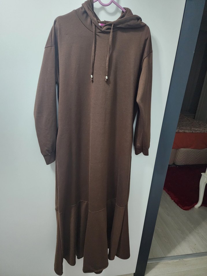 Kahverengi Kapüşonlu Salaş Uzun Elbise
