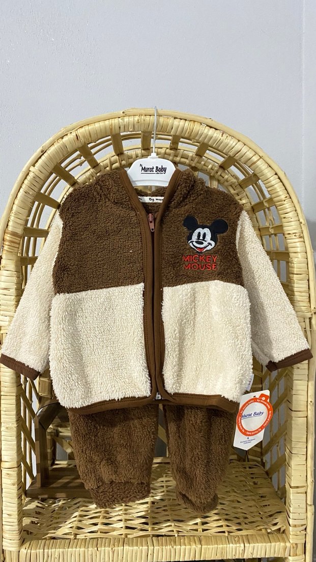 Koyu kahverengi ve bej renklerde, kapüşonlu ve uzun kollu, tüylü detaylı bebek takımı. Üzerinde işleme Mickey Mouse deseni bulunur. 6-9 ay 12-18 ay mevcut