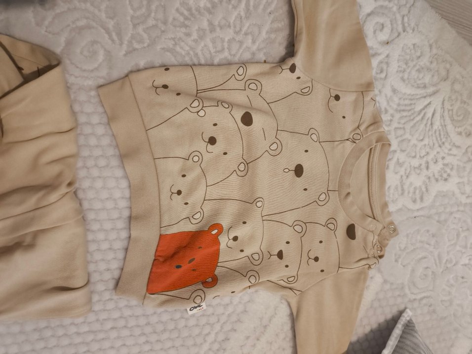 Uzun kollu, düğmeli kahverengi bebek body eşofman ikili takım Yumuşak ve sıcak kumaştan, baskılı ayıcık desenleriyle süslenmiştir.