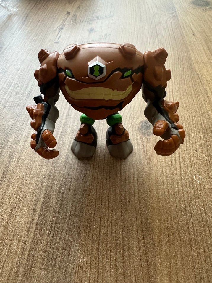 Kahverengi koyu renkte, eklemli kollara ve yeşil detaylara sahip aksiyon figürü.