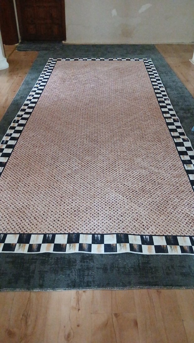 Kahverengi tonlarında, kare desenli geleneksel bir halıdır. Siyah-beyaz kareli çerçeve ile çevrilmiştir. dolabımda 50 ve 100 arası çok güzel ürünler mevcuttur toplu alımda yardımcı olurum