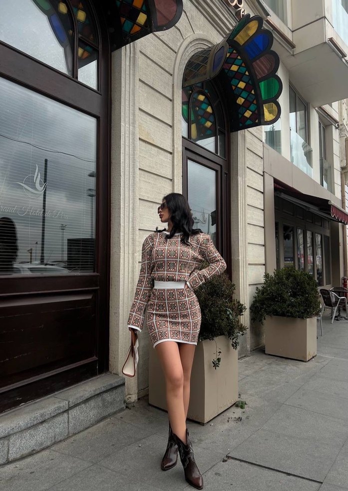 Kahverengi ve gri kareli, boğazlı ve uzun kollu, kemerli bel detayıyla fit kesim mini elbise. Sokak stiline uygun, günlük kullanıma ideal.