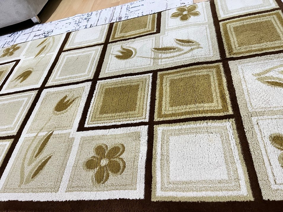 Açık kahverengi, kareli ve çiçek desenli konvansiyonel tarzda halı. Ev ortamına klasik bir dokunuş katar.
