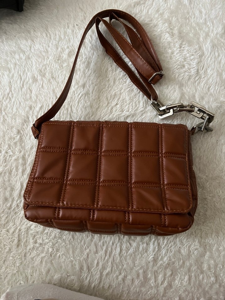 Kahverengi deri kadın çanta, kareli desene ve tokalı askıya sahiptir. Trendy casual sokak stiline uygundur. Sadece iç cep fermuarı çıktı