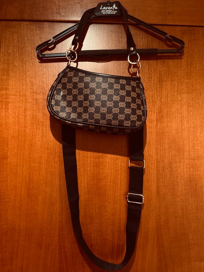 Kahverengi deri, kareli desenli, tokalı kadın çantası. Klasik Paris sokak tarzı ve ayarlanabilir uzun askıya sahip. Günlük kullanıma uygun.