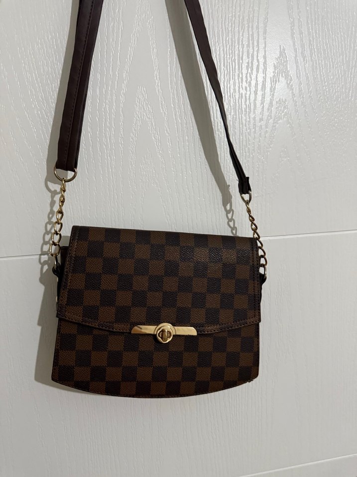 Kahverengi deri kadın çantası, kareli desene ve tokalı kapanışa sahiptir. Klasik zarafeti modern klasik tarzla buluşturur, parlak yüzeyiyle günlük kullanıma uygundur.