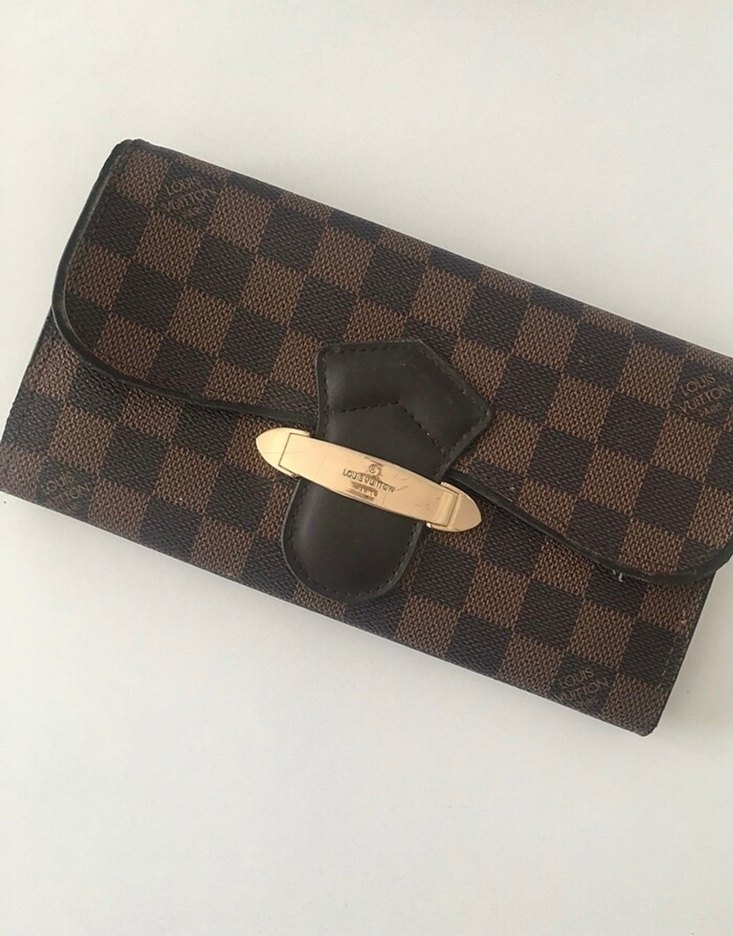 Kahverengi deri tokalı kadın cüzdanı, kareli deseni ve modern klasik tarzıyla Paris esintisi taşır, günlük kullanıma uygundur.