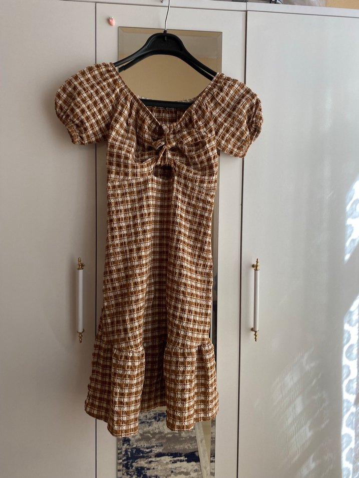 Parlak kahverengi kareli desen, kayık yaka, fırfır detaylı,bohem sokak tarzını yansıtıyor.