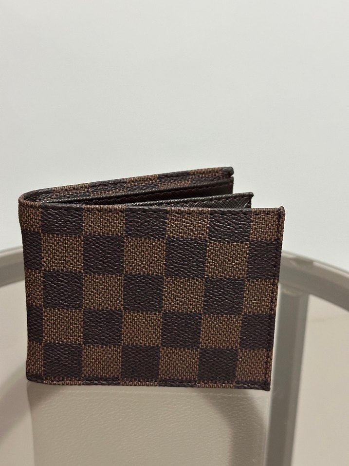 Kahverengi, koyu kareli desene sahip erkek cüzdanı. Diğer modeller de mevcut.
