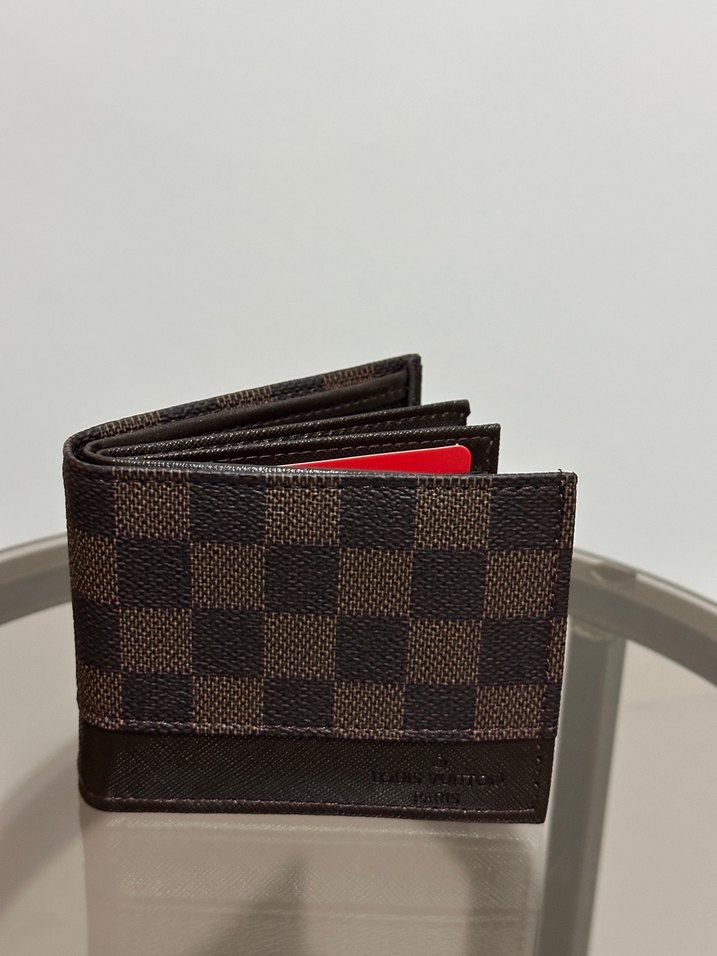 Kahverengi, koyu kareli desenli erkek cüzdanı.