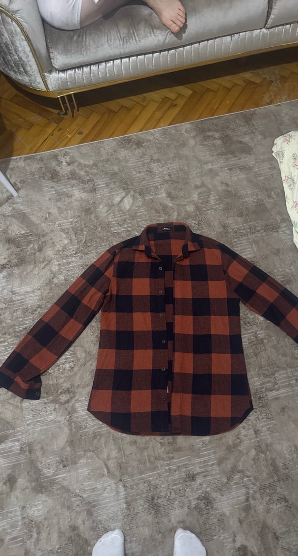 Kahverengi kareli, yakalı ve düğmeli erkek gömleği. Uzun kollu, bol kesim ve yumuşak, sıcak kumaştan yapılmıştır. Günlük kullanıma uygundur.