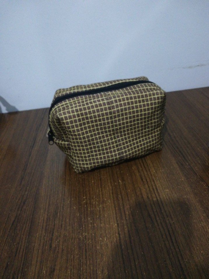 Sentetik kumaştan yapılmış, kahverengi kareli desenli ve fermuarlı kadın makyaj çantasıdır.
