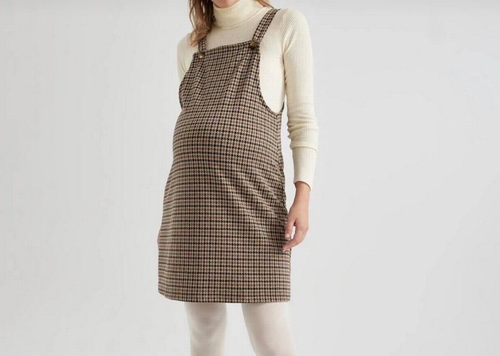Kahverengi kareli, midi boy hamile elbisesi. Askılı, tokalı ve sentetik kumaştan, günlük rahat kullanım için uygundur.